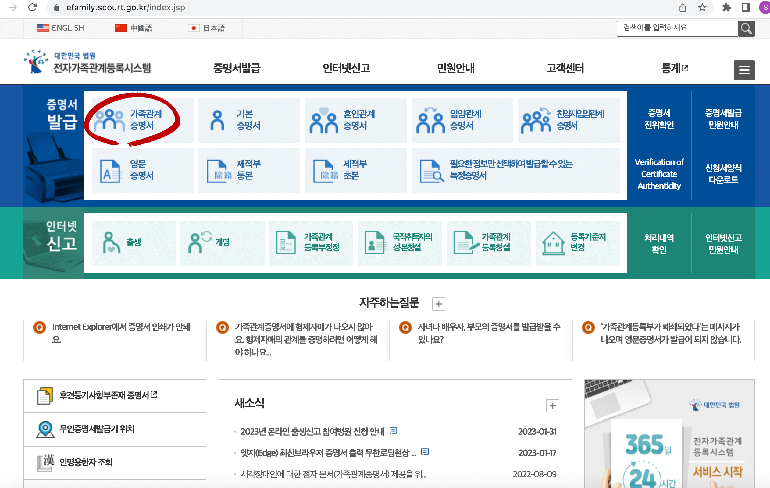 사이트를 클릭해 메인홈페이지로 이동한 뒤, 증명서 발급란의 가족관계 증명서를 선택해 주세요.