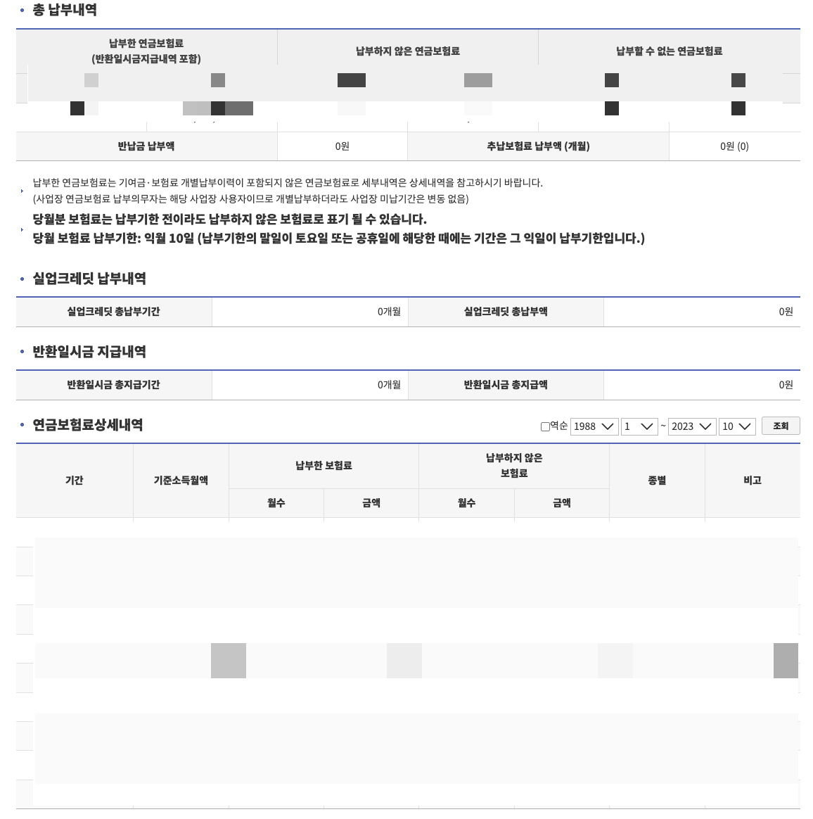 이밖에도 국민연금을 낸 연금보험료 상세내역도 아래 표에서 확인이 가능합니다.