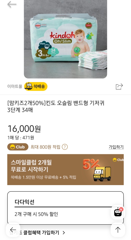 좀 더 저렴하게 기저귀나 아기용품을 구매하려고 한다면 맘키즈 클럽을 이용해 보시길 추천드립니다.