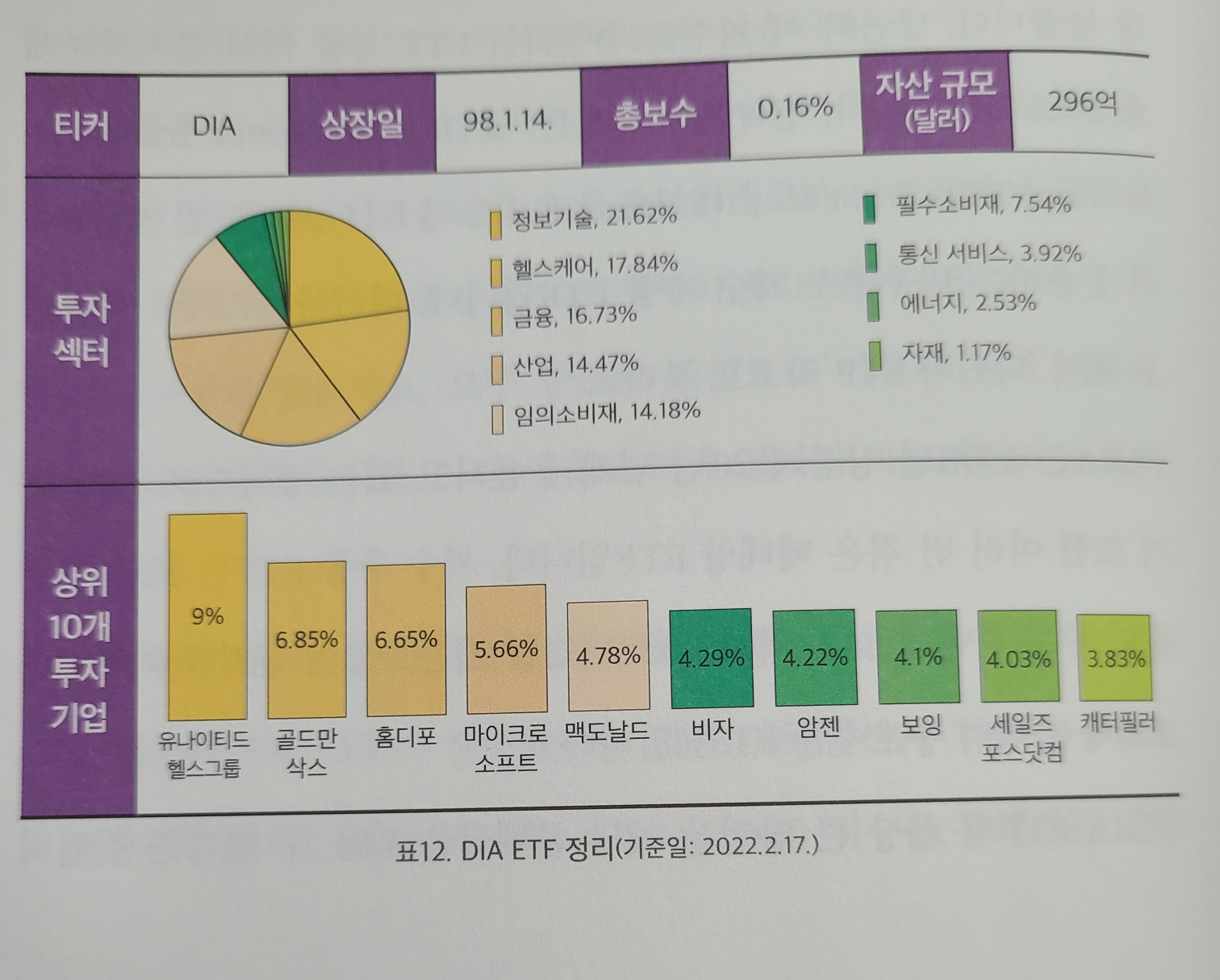 DIA는 98년에 상장된 ETF로 총보수는 0.16% 자산규모는 296억달러입니다.