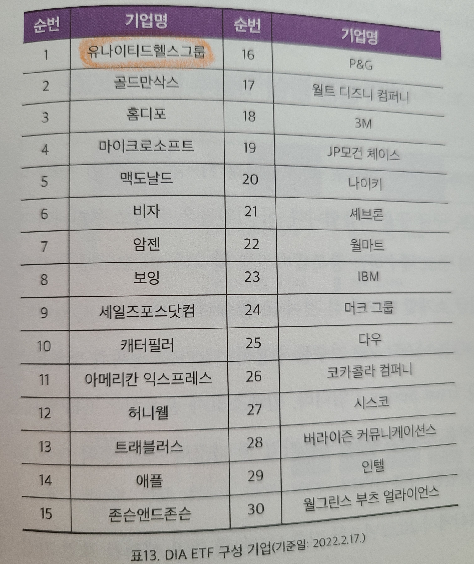 이 지수에 편입되어 있는 대표적인 기업엔 골드만삭스, 맥도날드, 보잉, 마이크롤소프트, 유나이티드 헬스그룹 등이 있고 이런 다우존스 지수를 추종하는 가장 대표적인 바로 ETF가 바로 DIA입니다.
