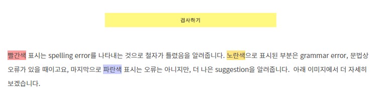 사용법은 아주 간단한데요. 내가 쓴 글을 복사해 빈칸에 붙여넣기를 하거나 직접 네모 공간 안에 써넣고 아래 노란색 검사하기 버튼을 클릭하면 문법적인 오류가 표시됩니다.