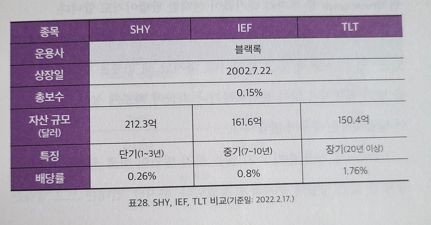 그중 먼저 1~3년 단기 채권에 투자하는 SHY ETF는 배당률 0.26%이며 7~10년 중기 국채에 투자하는 IEF는 배당률 0.8%, 끝으로 20년 이상 국채에 투자하는 TLT는 배당률이 1.76%로 세 상품 중 가장 높은 배당률을 가지고 있어요.