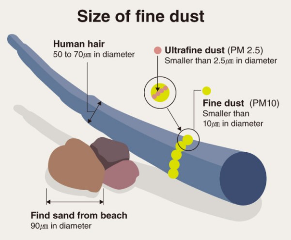 A particle of “ultrafine dust,” is smaller than 2.5 micrometers in diameter. The width of PM2.5 is about 30 times less than that of a human hair. “Fine dust,” or PM10, is particulate matter 10 micrometers or smaller in diameter.