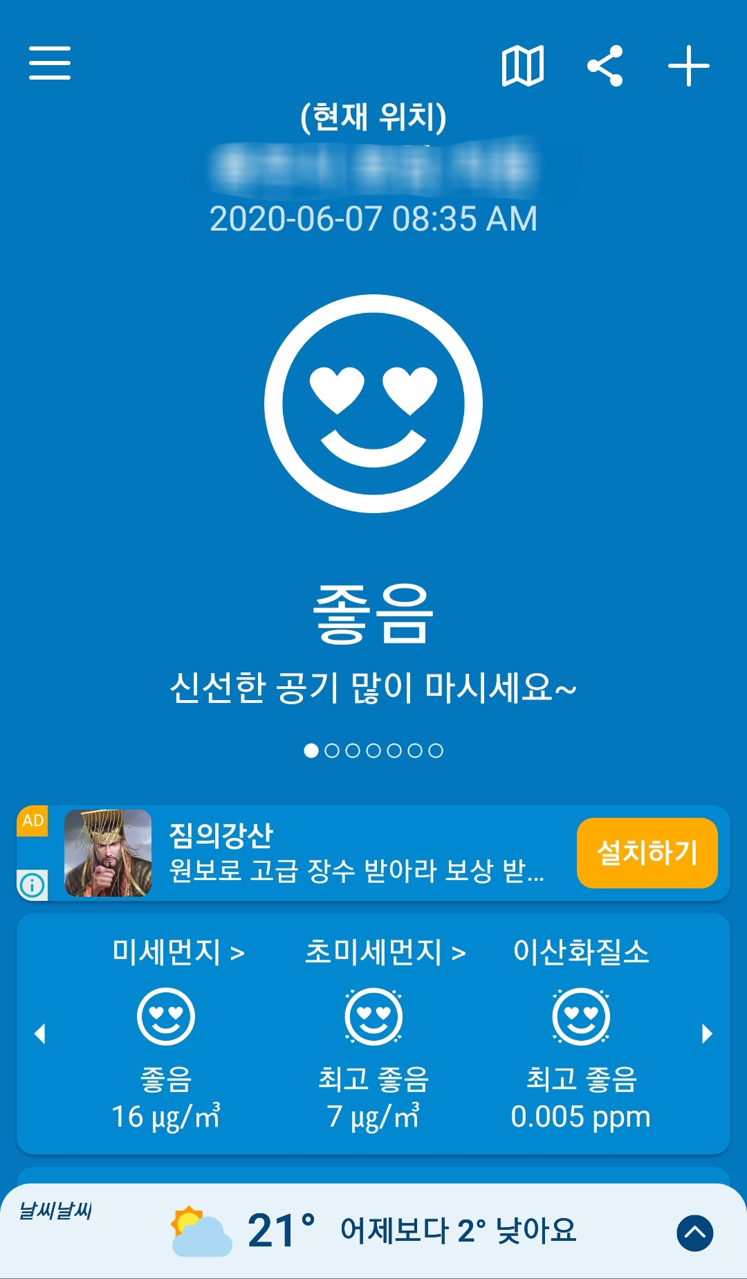 지금 이곳에서 보여주는 저희 동네의 수치는 미세먼지 16, 초미세 7 좋음을 나타내며 활짝 웃고 있네요.