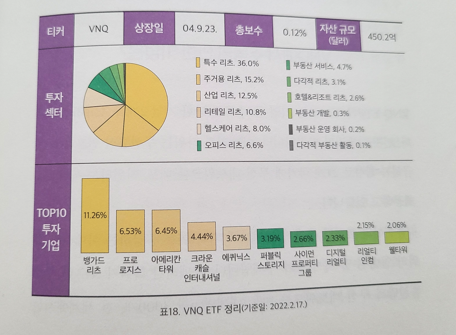 '나의 첫 ETF 포트폴리오'의 저자는 먼저 부동산 리츠에 투자할 수 있는 ETF 상품으로 VNQ ETF를 소개해 주고 있어요.
