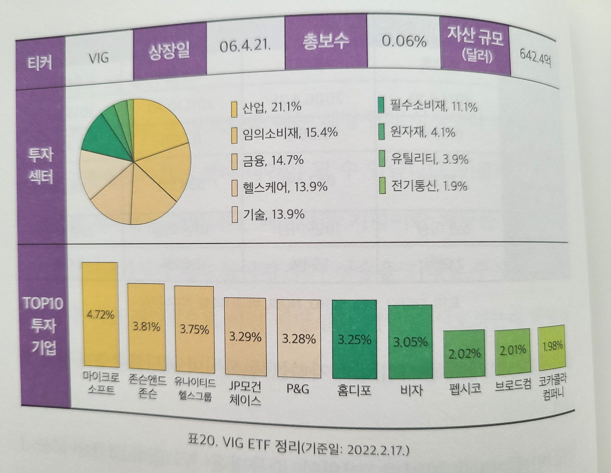먼저 VIG는 연평균 6.4% 배당 성장을 하는 종목으로 투자섹터는 산업 21.1%, 임의소비재 15.4%로 대표적 투자 기업으론 존슨앤드존스, 마이크로소프트, JP 모건 체이스 등이 있습니다.