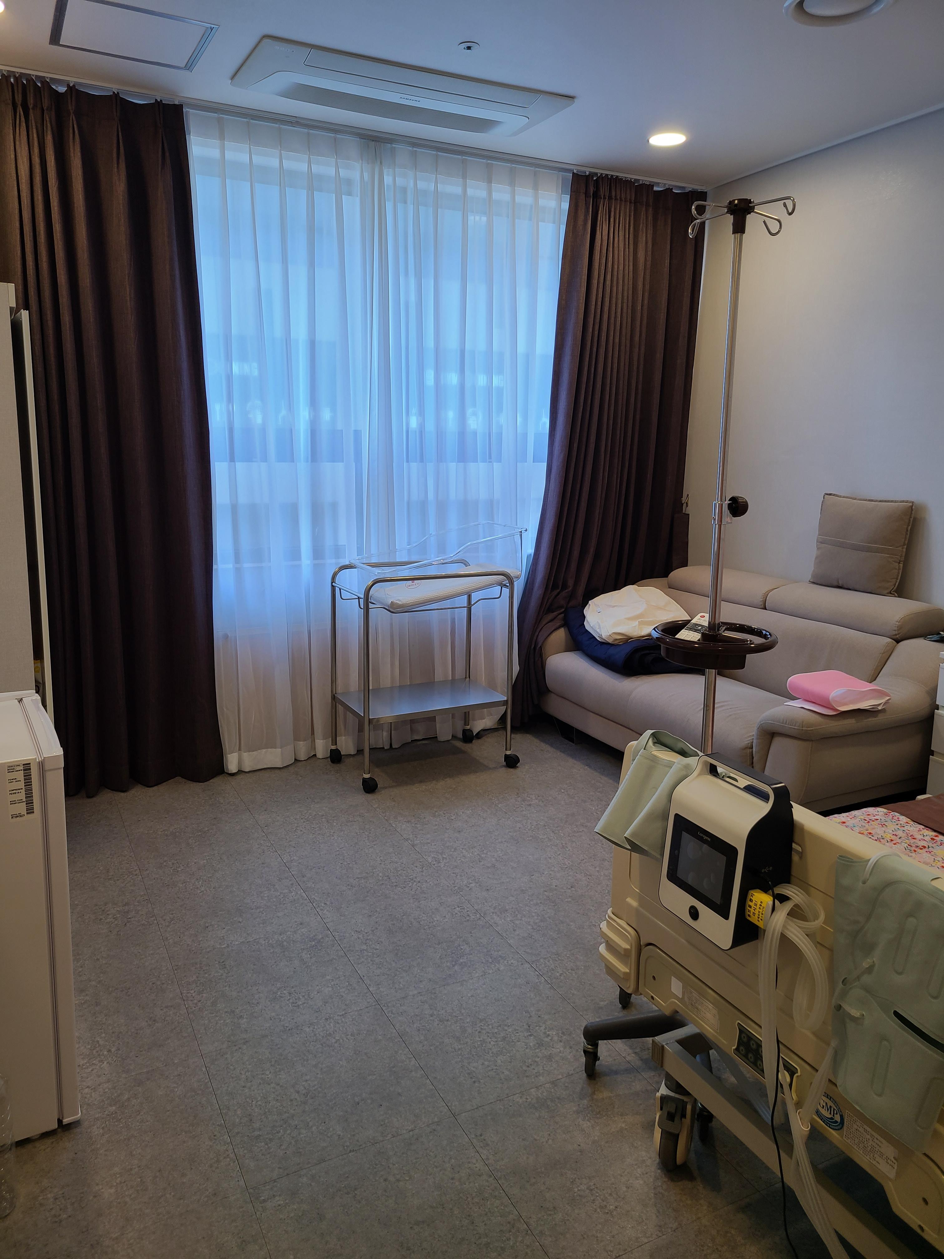 병실엔 간단히 모션베드,소파,서랍장,냉장고,TV 미니 옷장, 공기청정기+가습기, 아기침대와 세면대가 있어요. 화장실도 따로 마련되어 있구요.