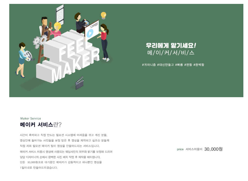 혹시 시간이 너무 촉박하고 좀 더 전문적인 서비스를 받고 싶다면 필 메이커에서 제공하는 이른바 메이커 서비스를 이용해보셔도 괜찮을 것 같은데요, 사진이나 동영상만 업로드하면 보정, 사진 배치 모두 해주시는 서비스랍니다.