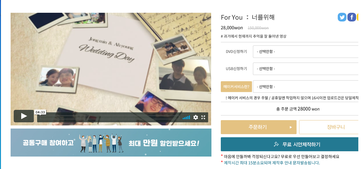 사진 보정을 약간씩 하고 순서에 맞게 배열해야 하는 수고로움이 있지만 우리의 영상을 내 손으로 직접 만들어보는 재미가 있더라고요. 참고로 저흰 별도로 dvd나 usb 신청 없이 제작했고 마지막에 보내주신 영상 파일을 웨딩홀에 메일로 보내 전혀 문제없이 식당 일어날 잘 사용했어요.
