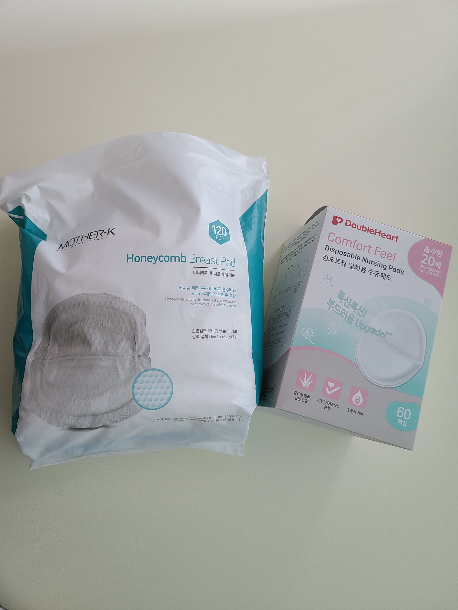 두 제품 모두 하나씩 모두 개별 포장되어 있어 위생 적으로 사용 가능한데 더블하트 컴포트필 패드와는 달리 마더케이 허니콤 제품은 뜯었을 때 수유패드의 가장자리가 함께 뜯기는 현상이 종종 발생하기도 해 그 점이 조금 불편하더라고요.