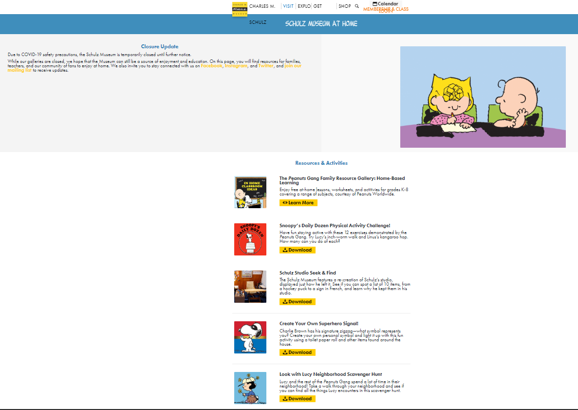 어렸을 때 스누피의 만화를 보면서 자란 이유도 있겠지만 어른이 되어서도 이 강아지의 매력에서 빠져나올 수가 없더라구요. 아무튼 피너츠의 원작자가 살던 Santa Rosa 소재의 슐츠 뮤지엄에서 평소 교육실에서 제공하던 엑티비티를 웹사이트에 올려 더 많은 사람들과 공유하고 있어요. 별도의 회원 가입 없이도 무료로 자료를 다운 받을 수 있으니 출력해서 아이들과 함께 혹은 어른들의 힐링을 위해 활용해보심 좋을 것 같아요.