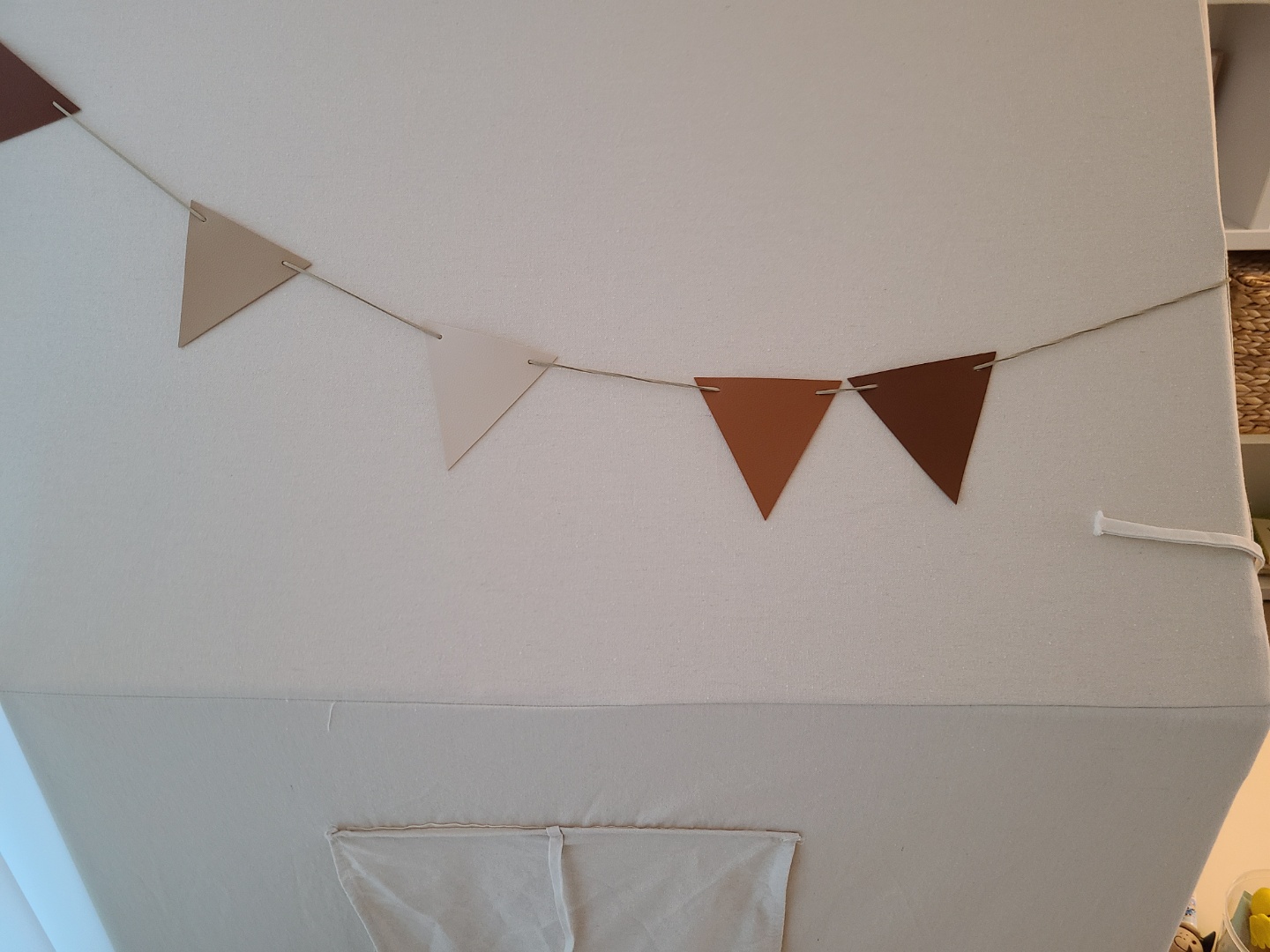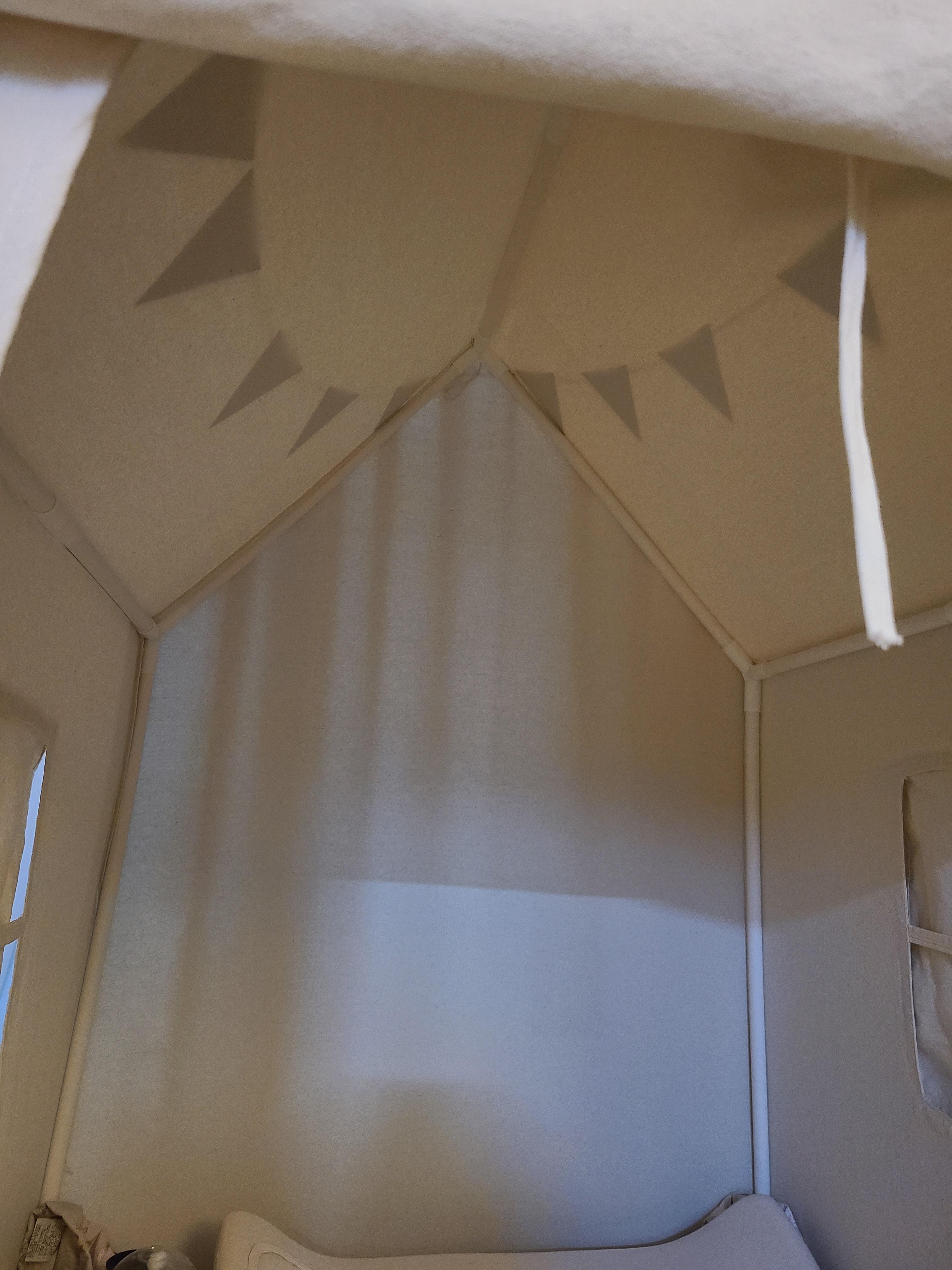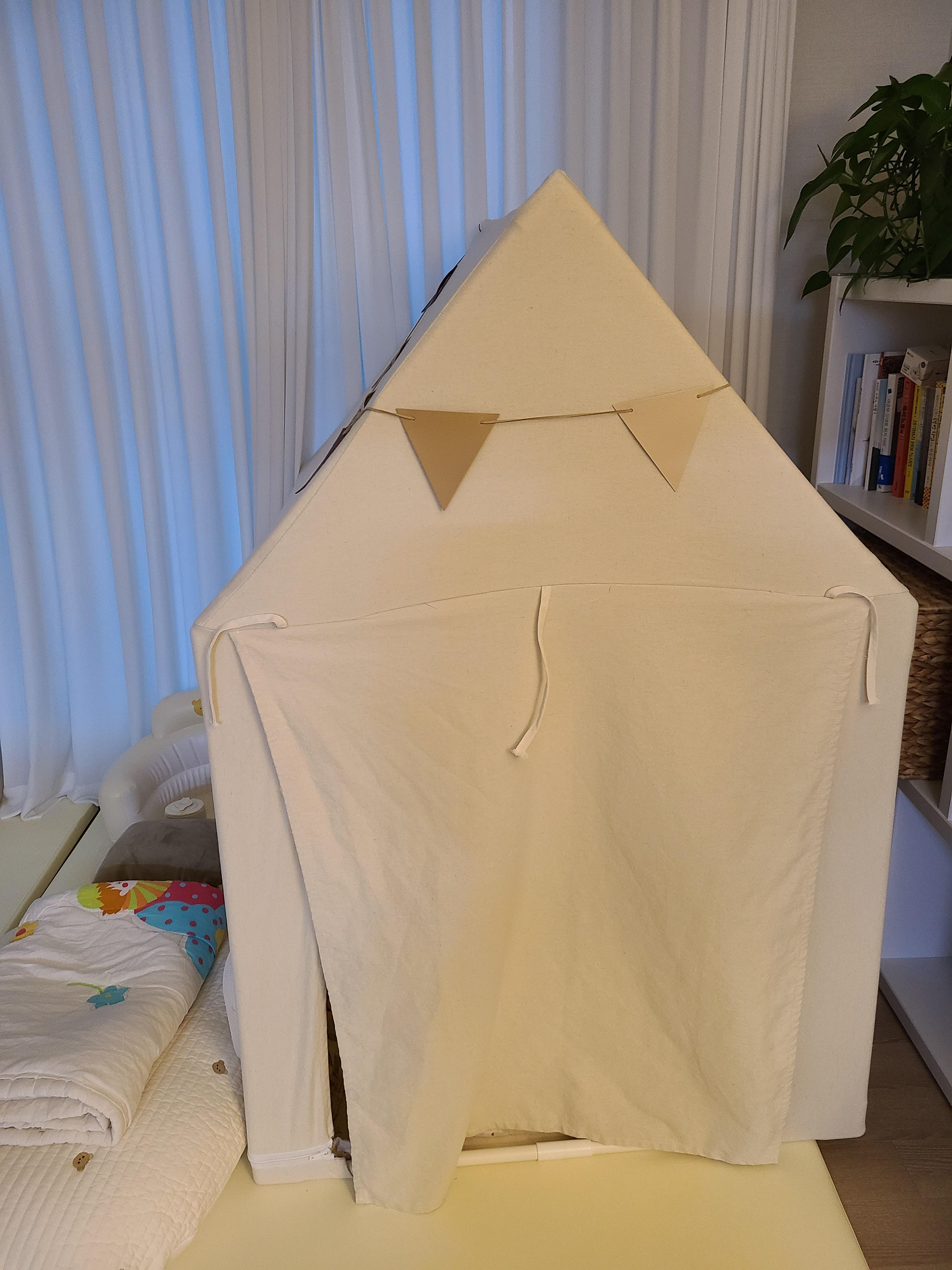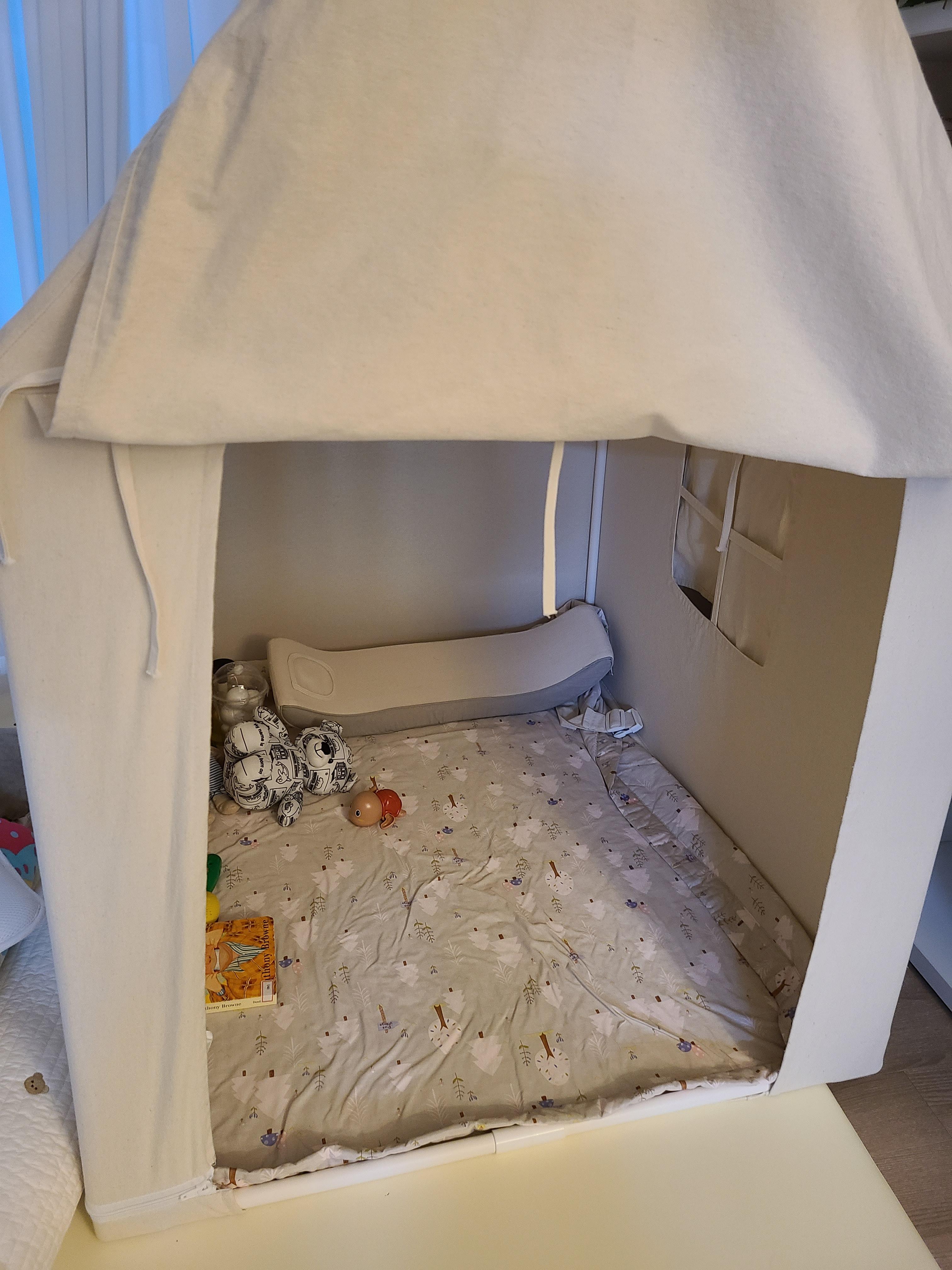 구매하기 전에 딸이 아직 10개월밖에 안되어, 주로 기거나 물건을 잡고 걸어 다니는 터라, 혹 텐트를 이리저리 끌고 다니거나 한쪽으로 힘을 줘 텐트가 넘어지는 게 아닐까 걱정이 들어 제조사에 문의했는데요, 아이가 안전에 대한 인지를 할 수 있을 때 구입하는 게 좋을 것 같다는 답을 주셨어요. 그래서 구입을 미뤄야 하나 살짝 고민을 했지만 잘 지켜보기로 하고 구입을 했는데, 다행히 걱정했던 일 없이 비교적 얌전히 텐트 안에서 잘 놀아주네요. 돌 전 아기에게도 충분히 좋은 선물이 될 것 같아요. (예쁜 가랜드도 선물로 받아 만족!)