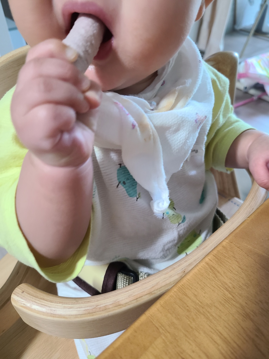 떡뻥은 6개월 이유식을 시작하면서부터 주기 시작했는데, 사실 의사 분들 중엔 떡뻥이 덩어리 져 목에 걸릴 수 있어 추천하지 않는 분들도 많다고 해요. 그래도 먹이기 간편하고 아이도 좋아해 먹이고 있는데, 떡뻥을 먹일 땐 자리를 뜨지 않고 항상 옆에서 잘 지켜보고 있어요.