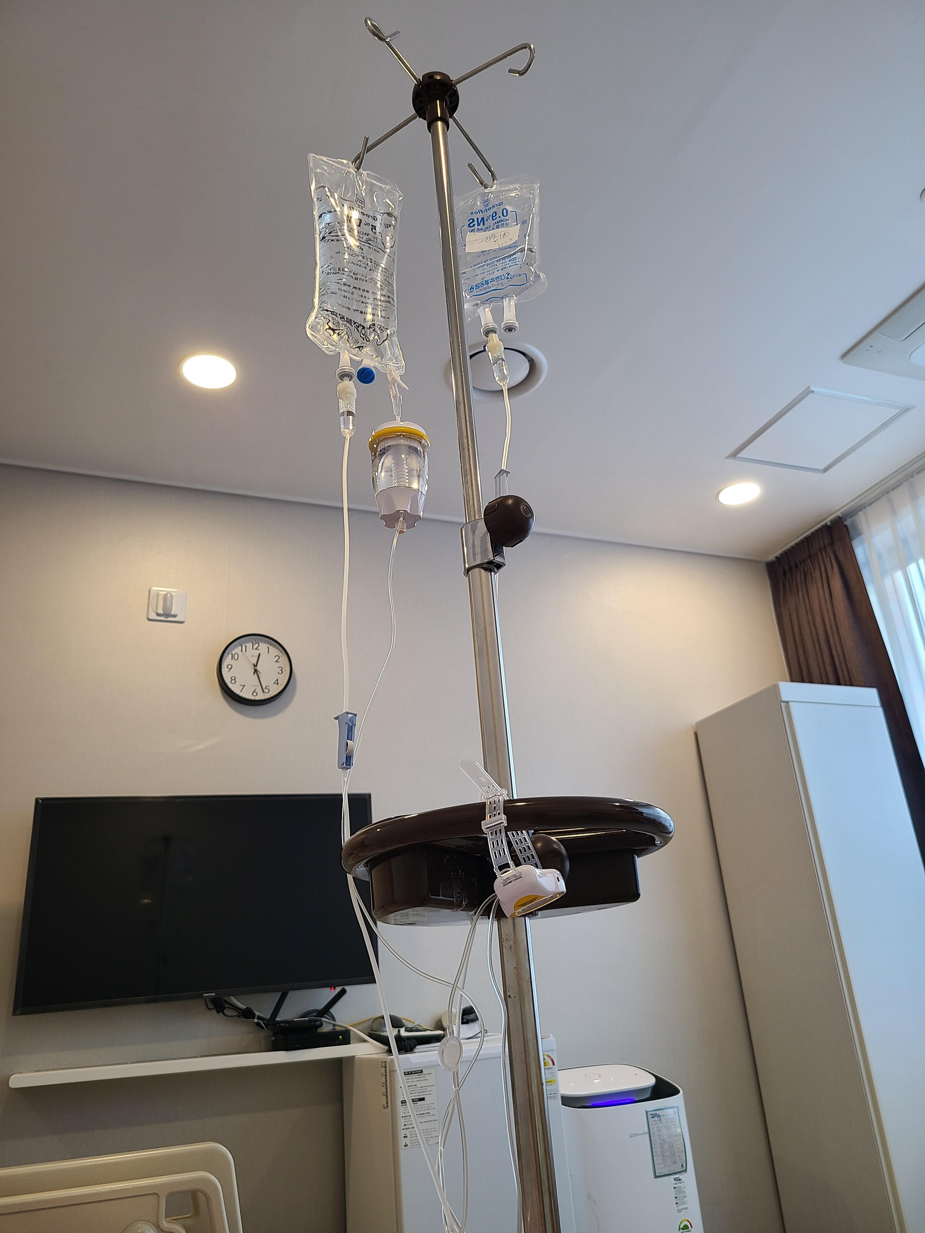 지금은 수술실에서 나와 무통주사와 페인버스터, 혈액손실이 있어 혈액을 보충해주는 주사에 수액까지 주렁주렁 달고 누워있어요.