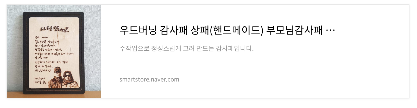 남들과는 다른, 하지만 정성스러운 선물을 해야겠다 싶으시다면 이번 어버이날 선물로 우드버닝 부모님 감사패를 선물해 보시길 바랍니다.