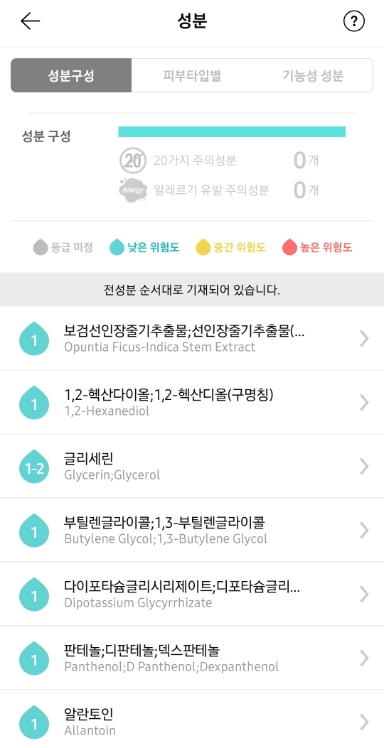 화해어플로 확인해봐도 역시 주의성분 알레르기 주의성분 0이네요.