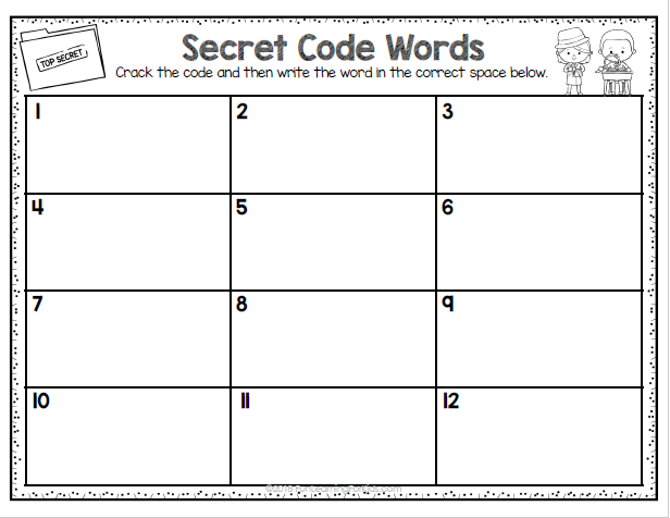 하나씩 아이들에게 암호를 해독하게 하고 마지막 워크시트에 이렇게 12개의 단어를 모두 적게 한 뒤 아이들과 그 철자와 뜻을 함께 맞춰보면 배운 단어를 복습하는 효과도 톡톡히 누릴 수 있는데요, 아래 파일을 열어 단어 워크시트를 만들어주세요.