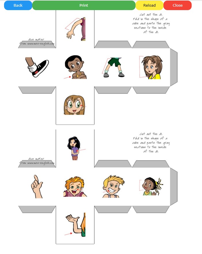 이렇게 만들어 주사위가 완성되면 주사위를 굴려, 나오는 그림에 해당하는 단어를 말하게 하거나 그것을 너무 쉽게 한다면 그 단어의 spelling까지 말하게 해주세요. 만약 텍스트가 있는 주사위를 만든다면 그 텍스트의 설명과 일치하는 그림이 나온 경우 아이에게 혹은 팀에게 포인트를 주는 방식으로 활용할 수도 있어요.