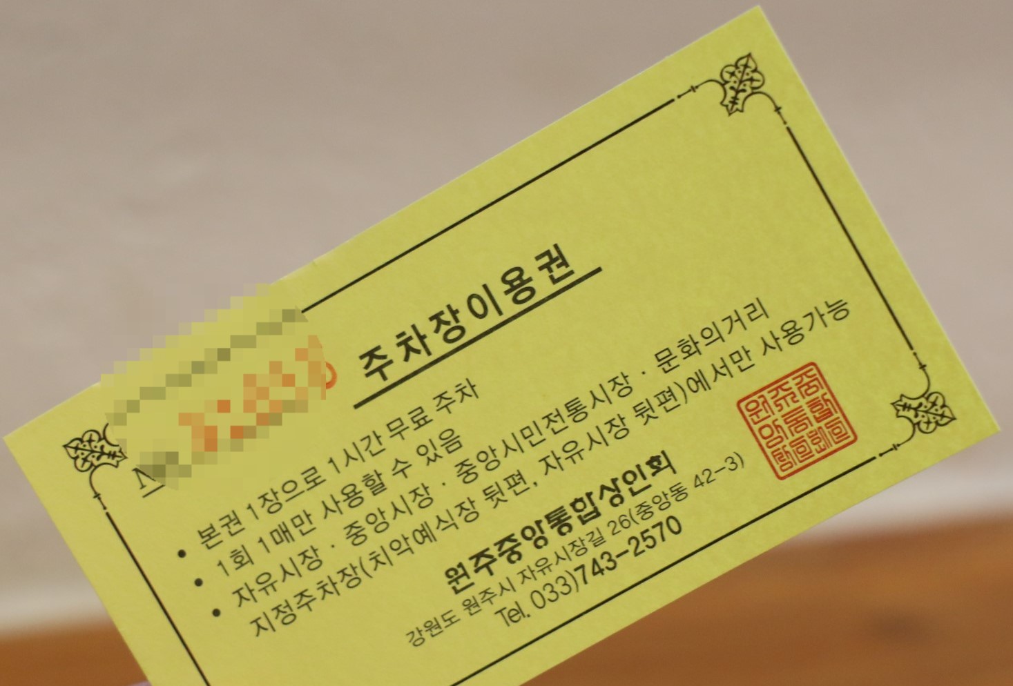 밥을 먹고 나서 "주차했는데 영수증이나 주차권 주세요~" 라고 꼭 말씀하세요. 그럼 이렇게 생긴 노란색 주차권을 주시는데 이 주차권으로 1시간 무료 주차/ 1회 1매만 사용/ 자유시장, 중앙시장, 중앙시민전통시장, 문화의 거리 지정 주차장(치약 예식장 뒤편, 자유시장 뒤편) 사용이 가능해요.