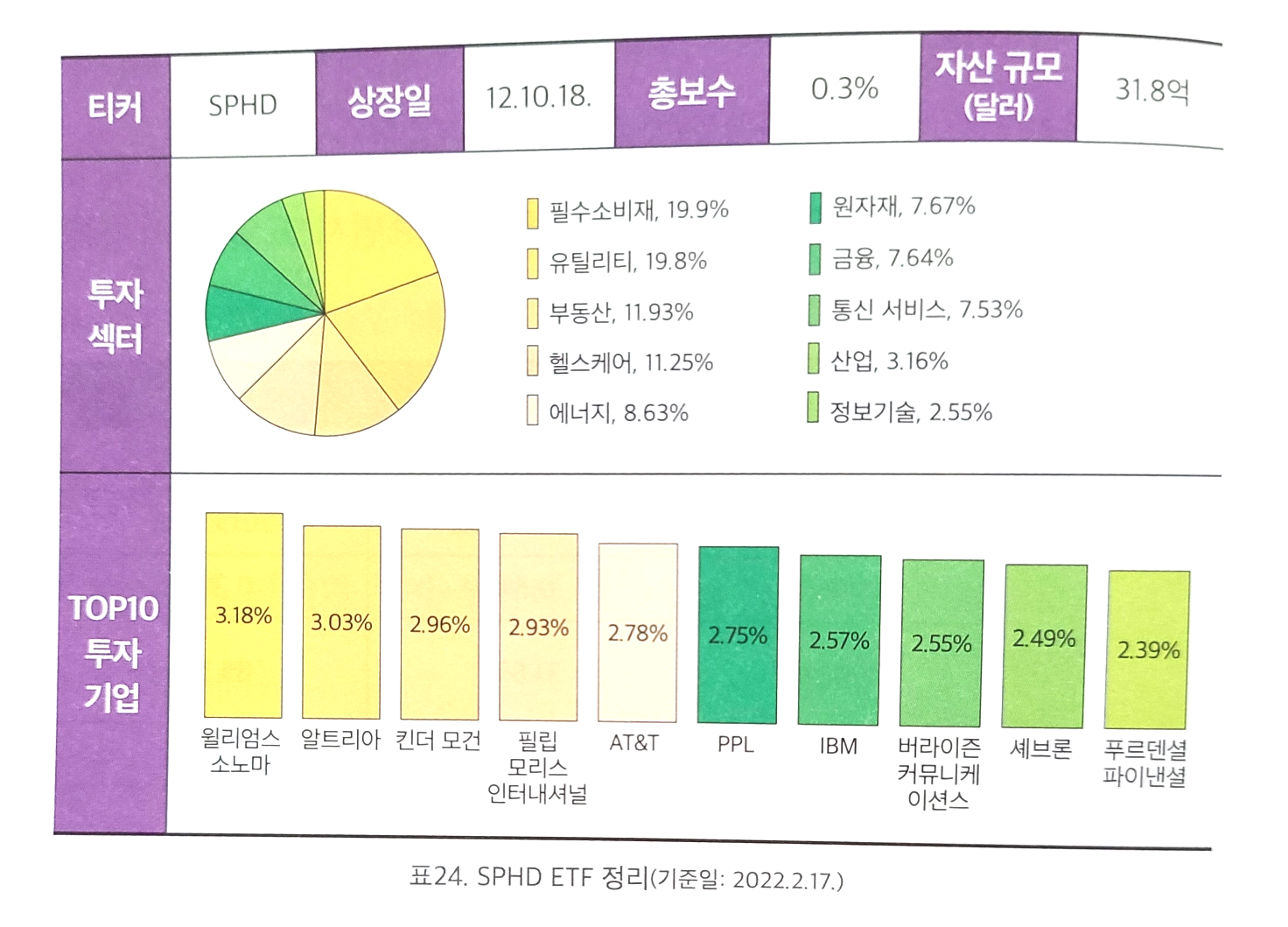 SPHD는 필수 소비재와 유틸리티 분야에 가장 많은 투자를 하고 있으며 비교적 안정적인 수익 구조를 가진 기업에 투자해 주주들에게 배당을 환원하고 있다고 합니다.