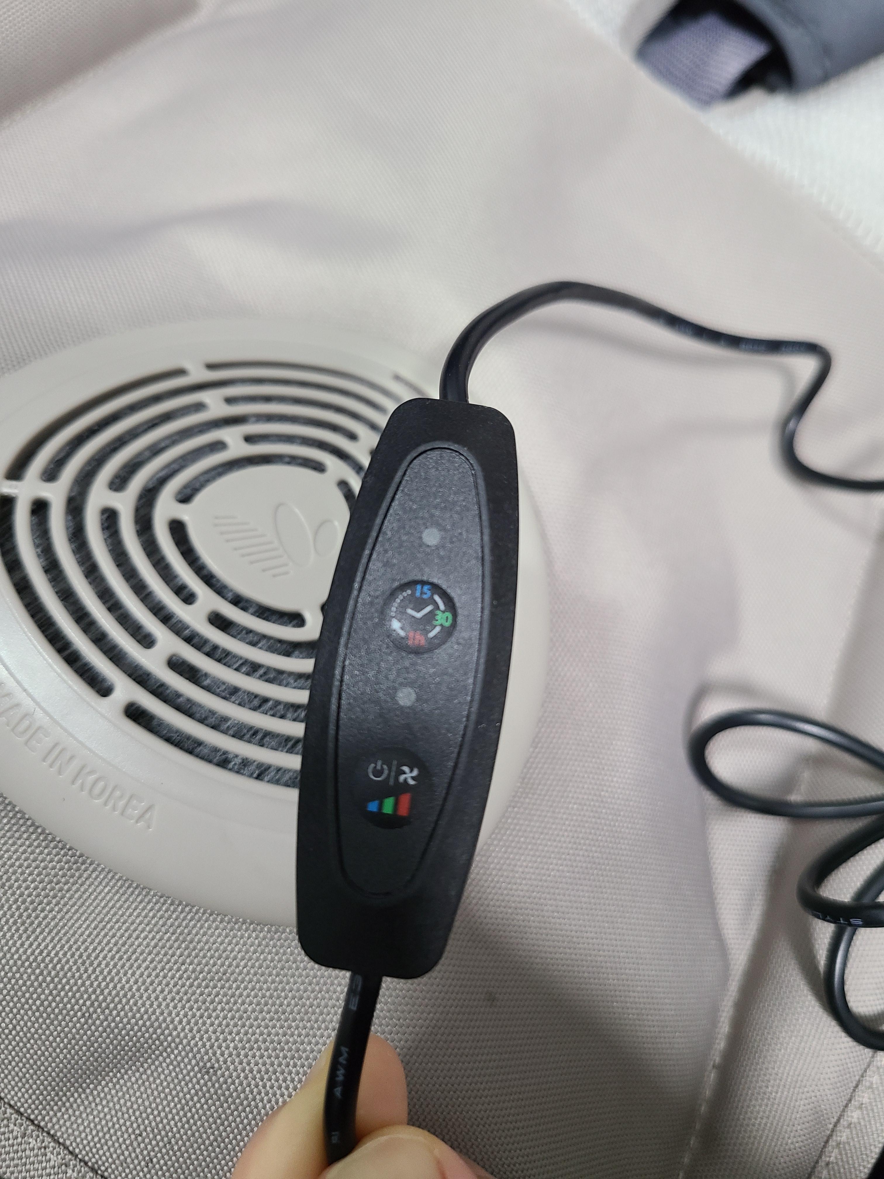 이 제품 역시 여타의 통풍시트처럼 보조배터리를 연결해서 사용하는 제품으로 1단~3단까지 풍속 조절이 가능하고 타이머도 15분, 30분, 한 시간,연속으로 설정 가능한데 연속 네시간 이상 사용은 권장하고 있지 않아요.