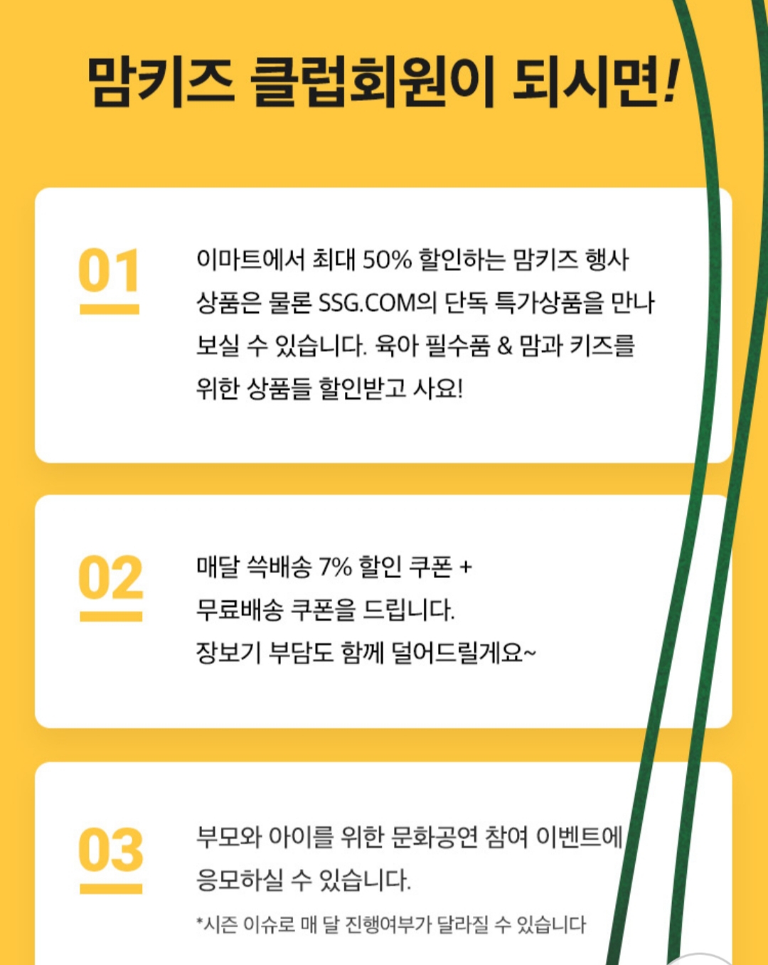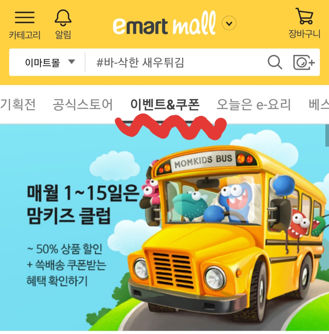 매월 1일~15일, 15일 동안 맘키즈 행사 상품을 최대 50%까지 할인받을 수 있고 이마트 7% 할인쿠폰과 함께 4만 원 이상을 구매하지 않아도 월 1회 무료배송 쿠폰을 받으실 수 있어요. 앱이나 이마트몰의 이벤트&쿠폰 카테고릴 선택하면 쉽게 찾아갈 수 있을 거예요.