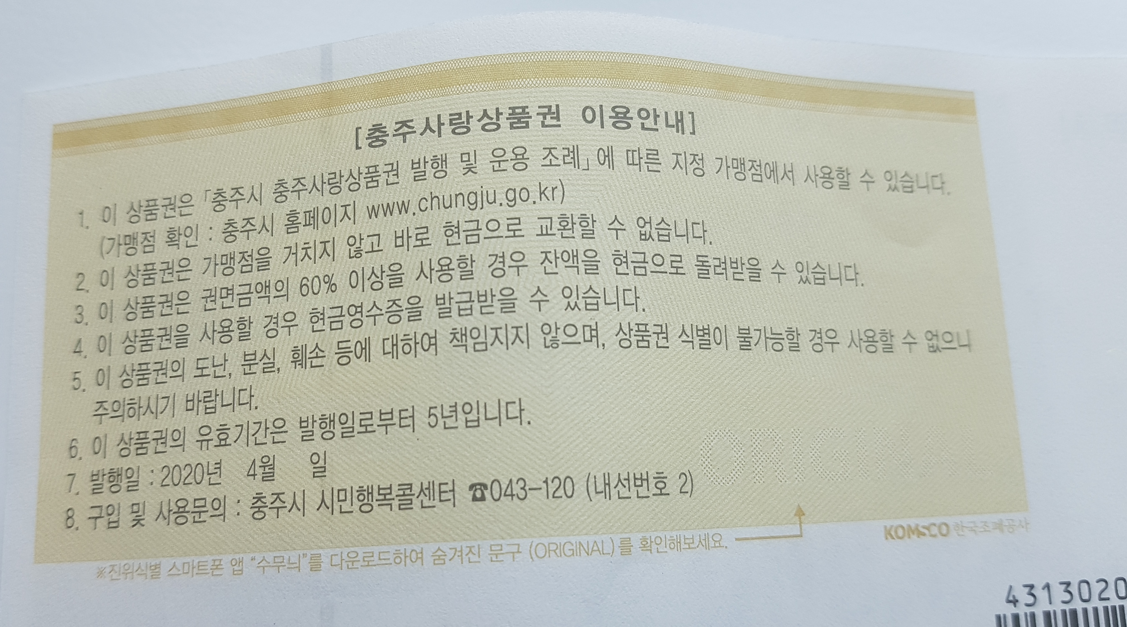 직접 방문해야 한다는 번거로움이 있지만 약간의 발품을 팔면 즉시 할인 혜택을 받을 수 있으니 조금 고생스럽더라도 구매를 추천해드리고 싶어요. 상품권은 지역내 가맹점에서 사용이 가능한데요. 음식점이나 병. 의원, 농축협 마트 등 충주 내 4천 400여곳에서 사용이 가능하다고 해요. 오는 6월에는 젊은 층을 겨냥해 몇몇 다른 지역에서 선보이고 있는 선불형 카드상품권도 출시된다고 하니 좀 더 편리하게 사용이 가능할 것 같아요. 상품권은 5천원, 만원, 5만원, 10만원권이 있습니다. 저희는 주유를 할 때 좀 더 혜택을 받기 위해 구입했구요, 상품권 뒷면을 보면 현금 영수증 발행도 가능하고 액면가의 60%이상 사용시 잔액을 현금으로 돌려받을 수 있다고 하니 이 점도 꼭 기억해두면 좋을 것 같아요