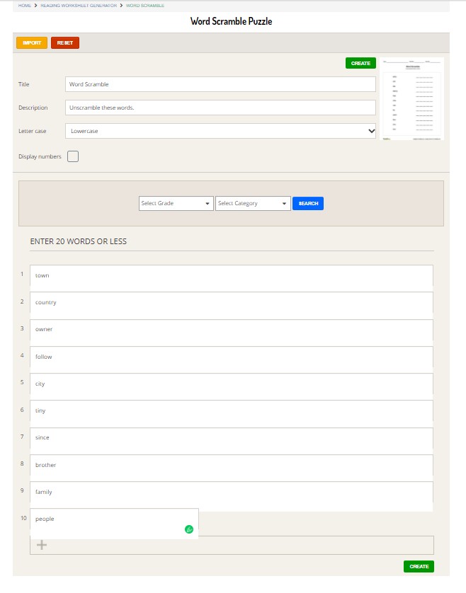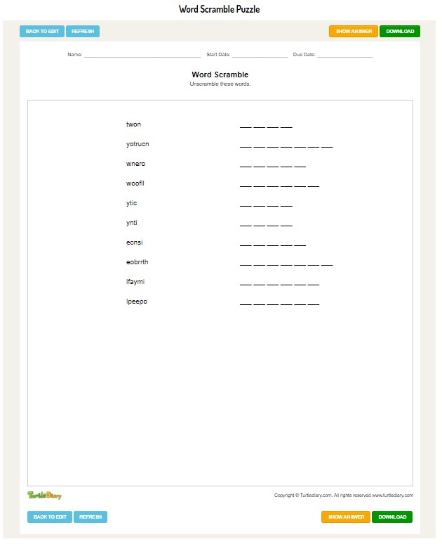 예를 들어 Word Scramble은 단어의 철자 순서를 무작위로 섞어 놓고 아이들에게 철자를 순서대로 정확하게 배열해 단어를 완성시키는 연습을 할 수 있는 워크시트를 만들 수 있는 프로그램인데요,