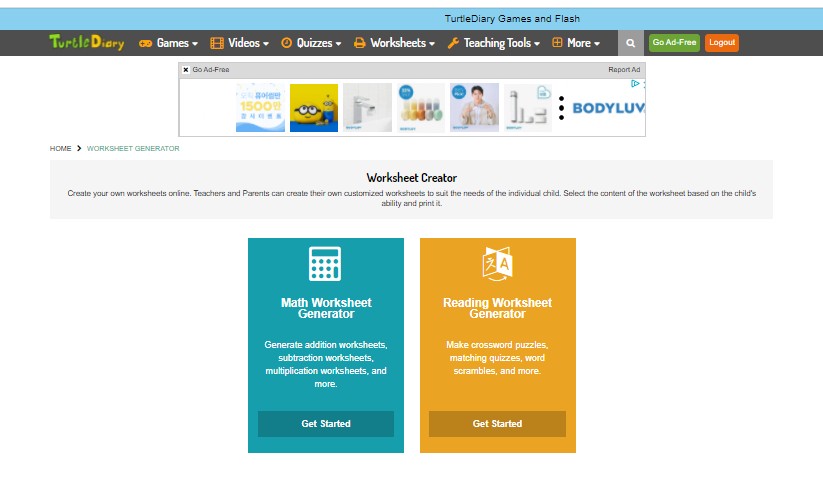 Math Worksheet Generator , Reading Worksheet Generator 이렇게 두가지 선택 박스가 나오는데요, 이 둘 중 Reading Worksheet Gernerator를 선택하면