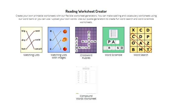 Matching Lists, Crossword Puzzles, Word Scramble, Word Search, Compound words Worksheet 이 나옵니다.