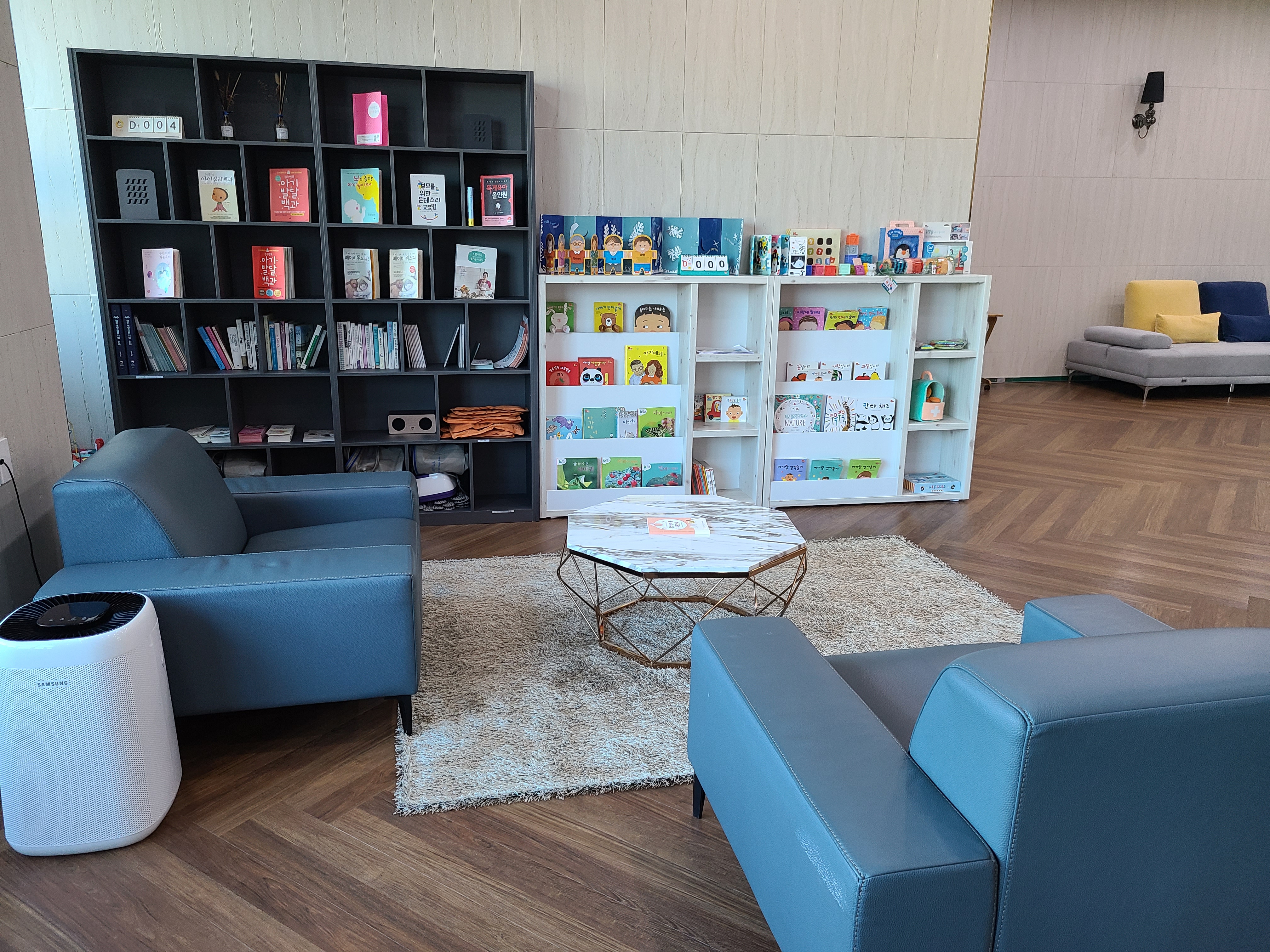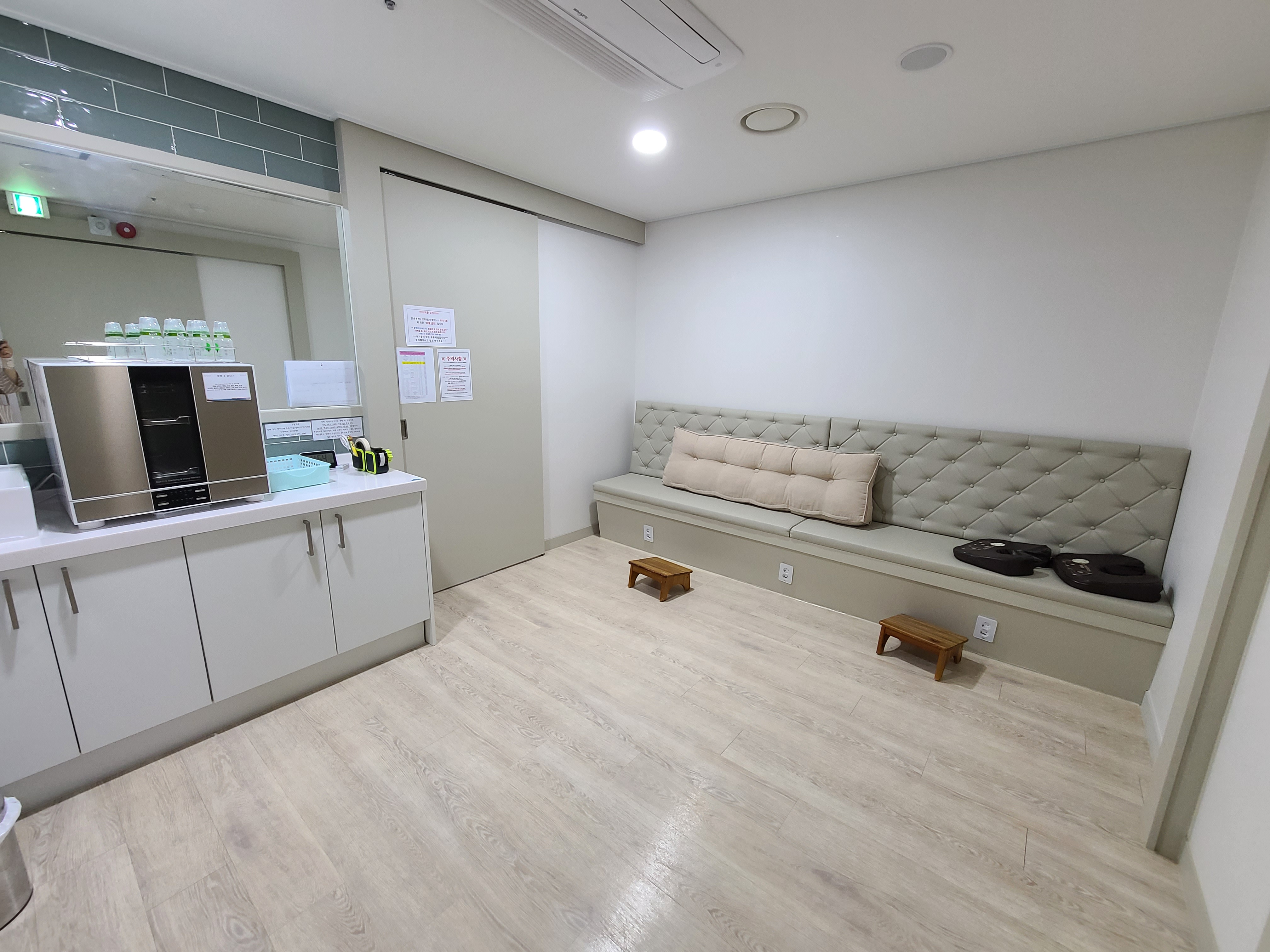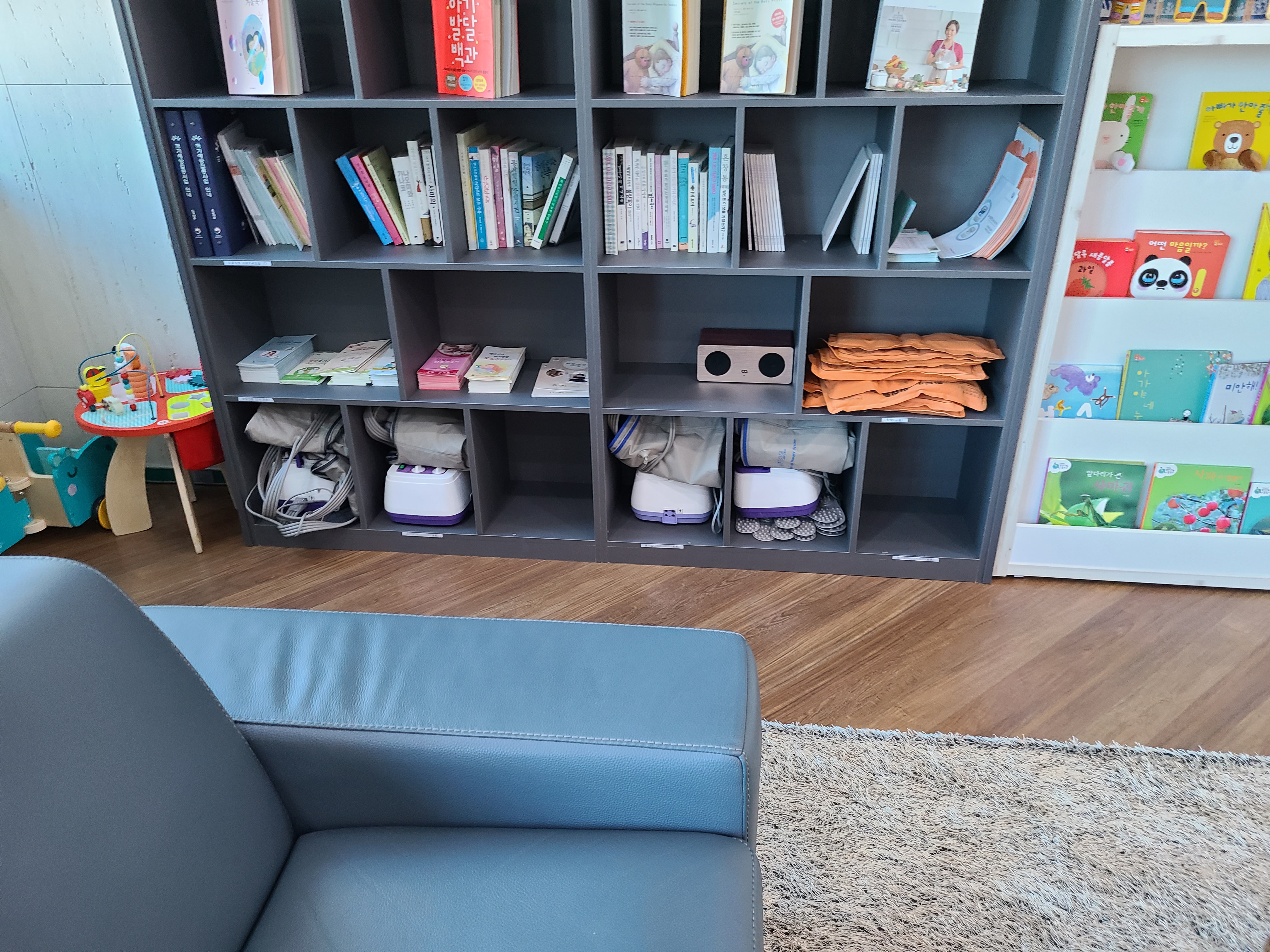 8층엔 널찍한 공용 로비와 객실들. 신생아실, 공동으로 사용 가능한 찜질팩과 책들. 다리 공기압 마사지기가 마련되어 있는 공간이 있어요.