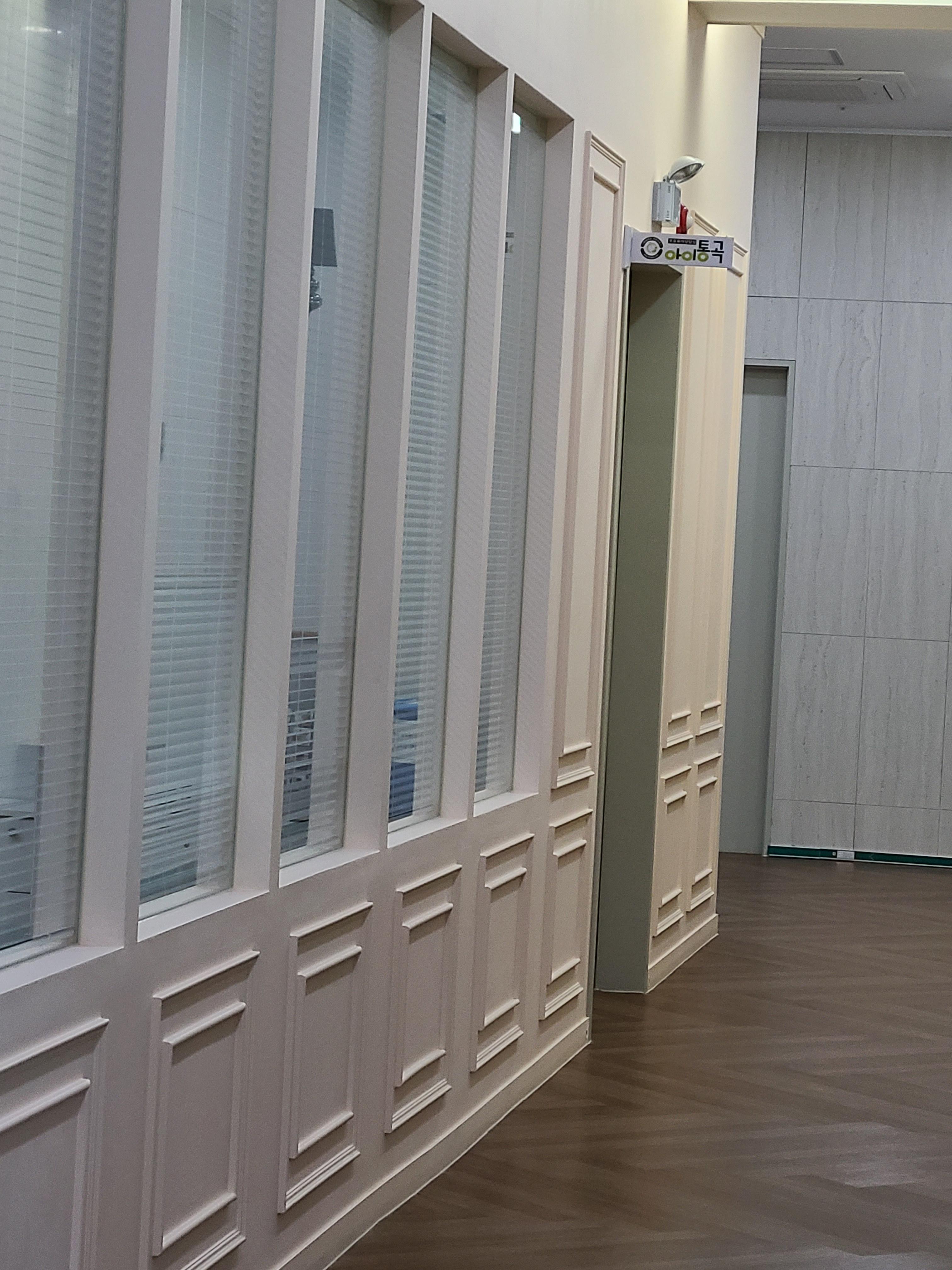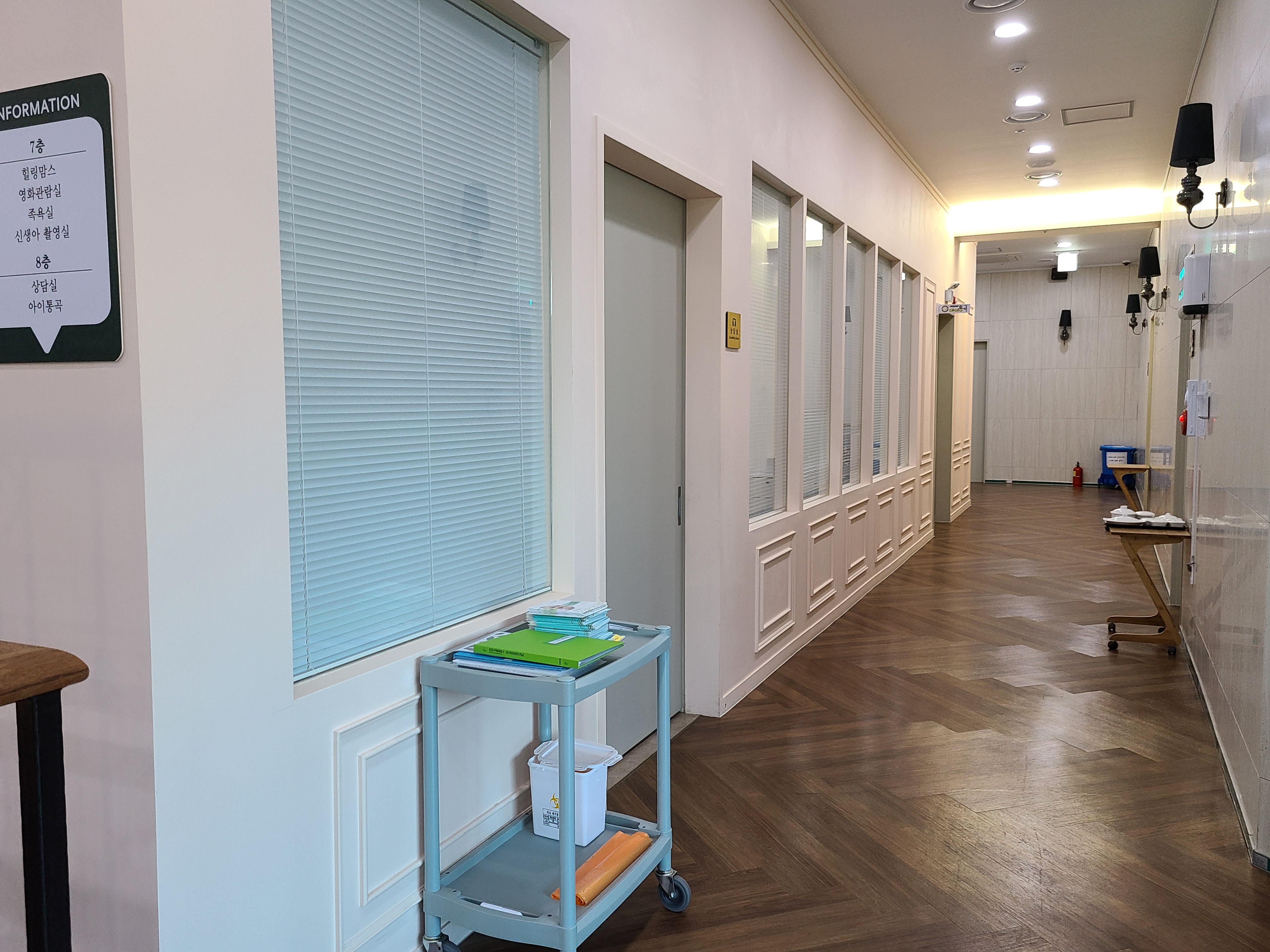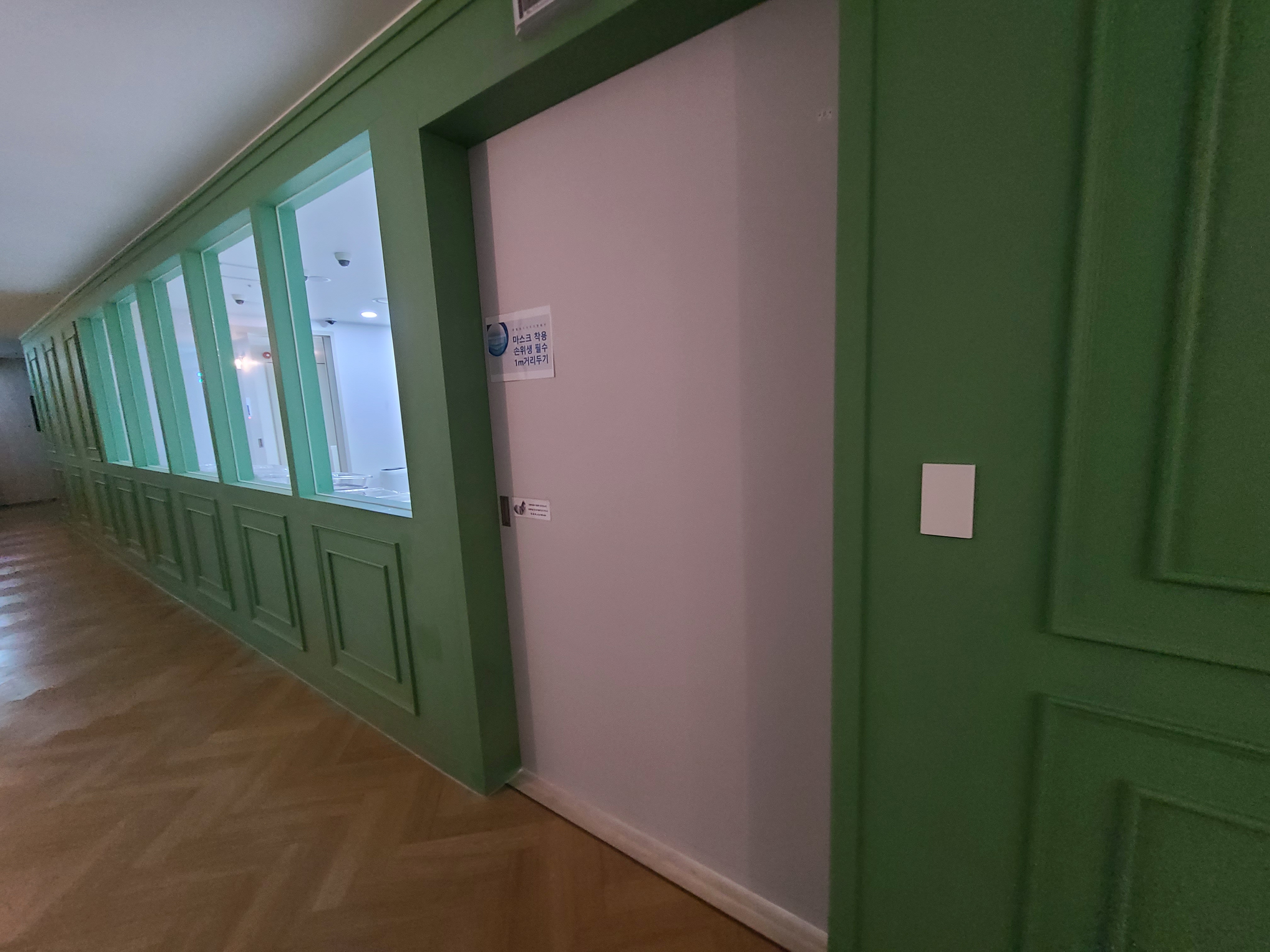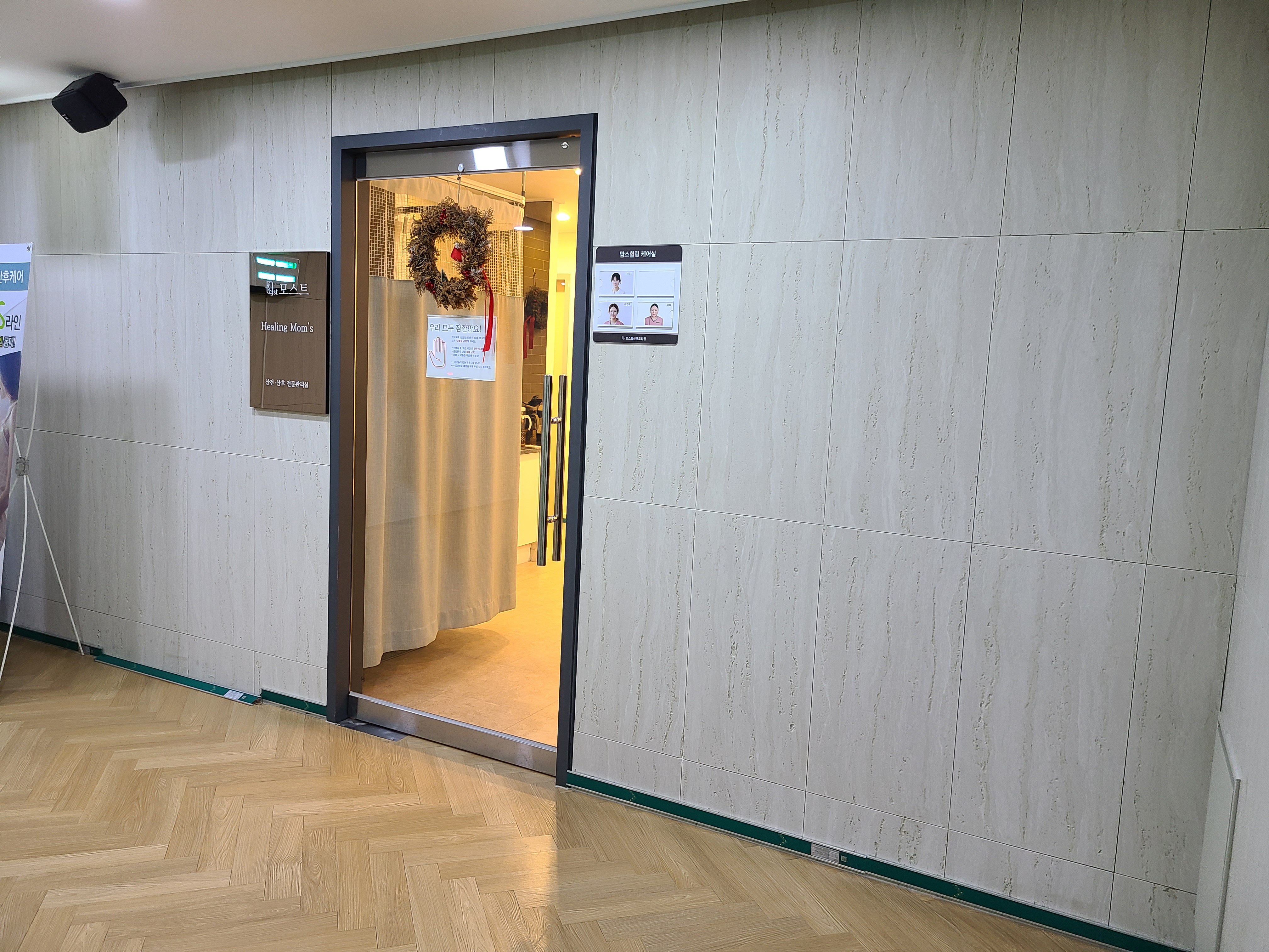 모스트 산후조리원은 건물의 7층과 8층을 함께 사용하는데 전 7층에 머물렀습니다. 7층에도 출입구가 있긴 하지만 메인 출입구는 8층으로 에어샤워 부스를 통과해 출입해야 해요. 아무래도 요즘 같은 코시국엔 이런 장치가 있어 좀 더 안심이 되더라고요.