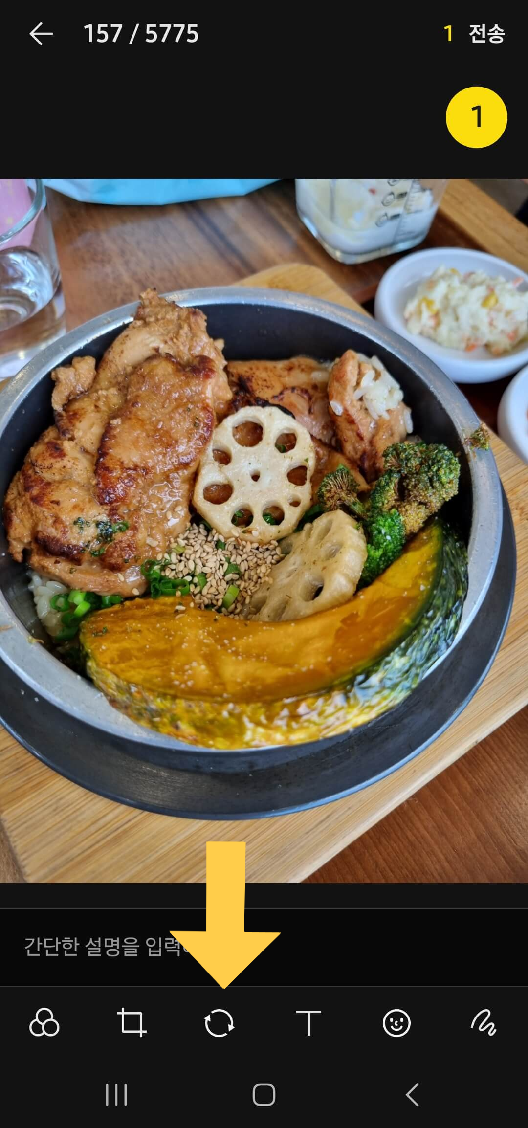 또 하나, 같은 방법으로 꺽쇠 모양을 클릭한 뒤 보내고자 하는 사진을 회전시키거나 이미지를 보정하고 이모티콘이나 글을 사진 위에 직접 쓸 수도 있어요.