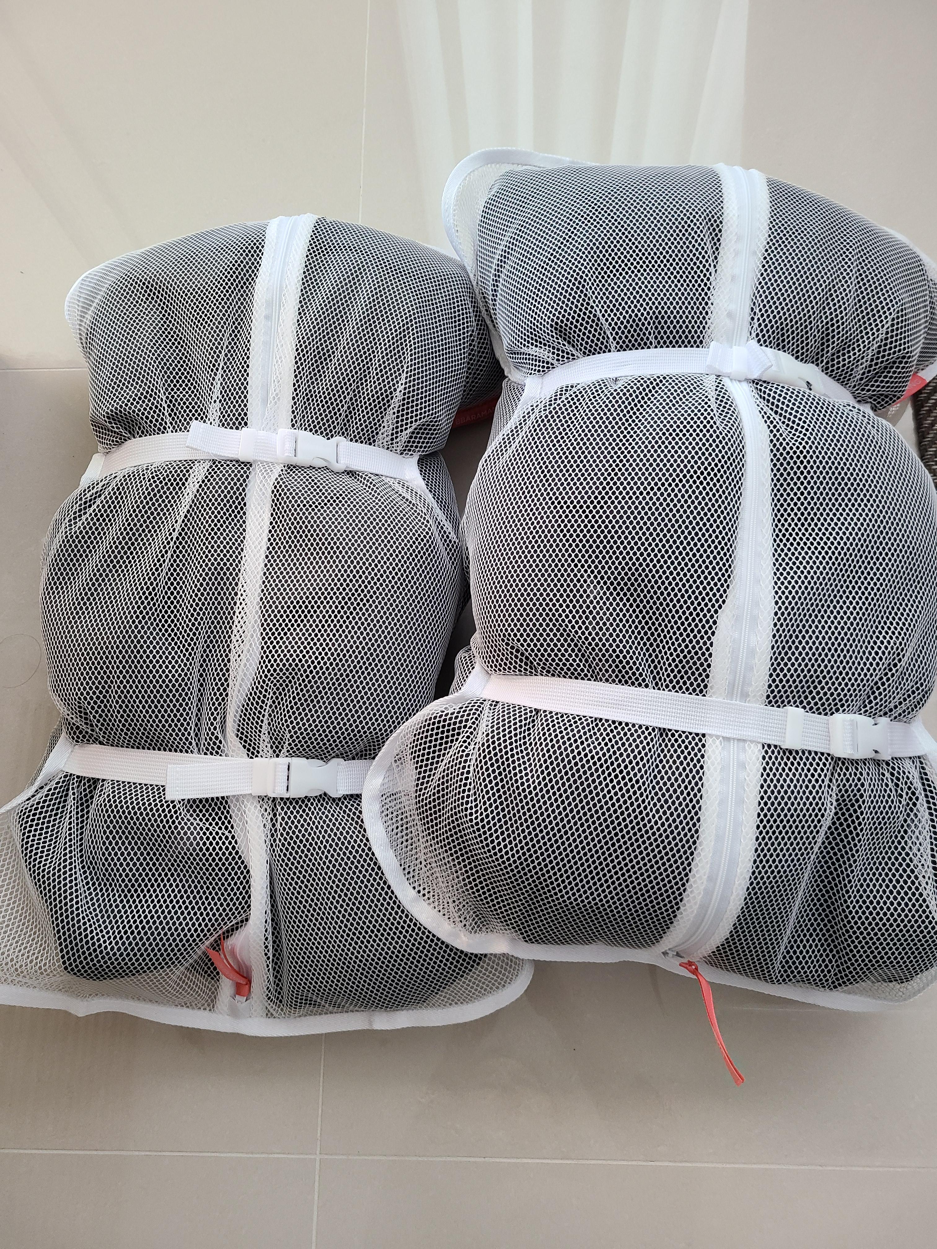 일반 망이 아니라 이렇게 벨트로 군데 군데 조여주는 망을 활용하니 정말 세탁하고 난 후에 패딩도, 베개도 털 뭉침이나 솜뭉침이 없어 개인적으론 만족스러웠습니다.