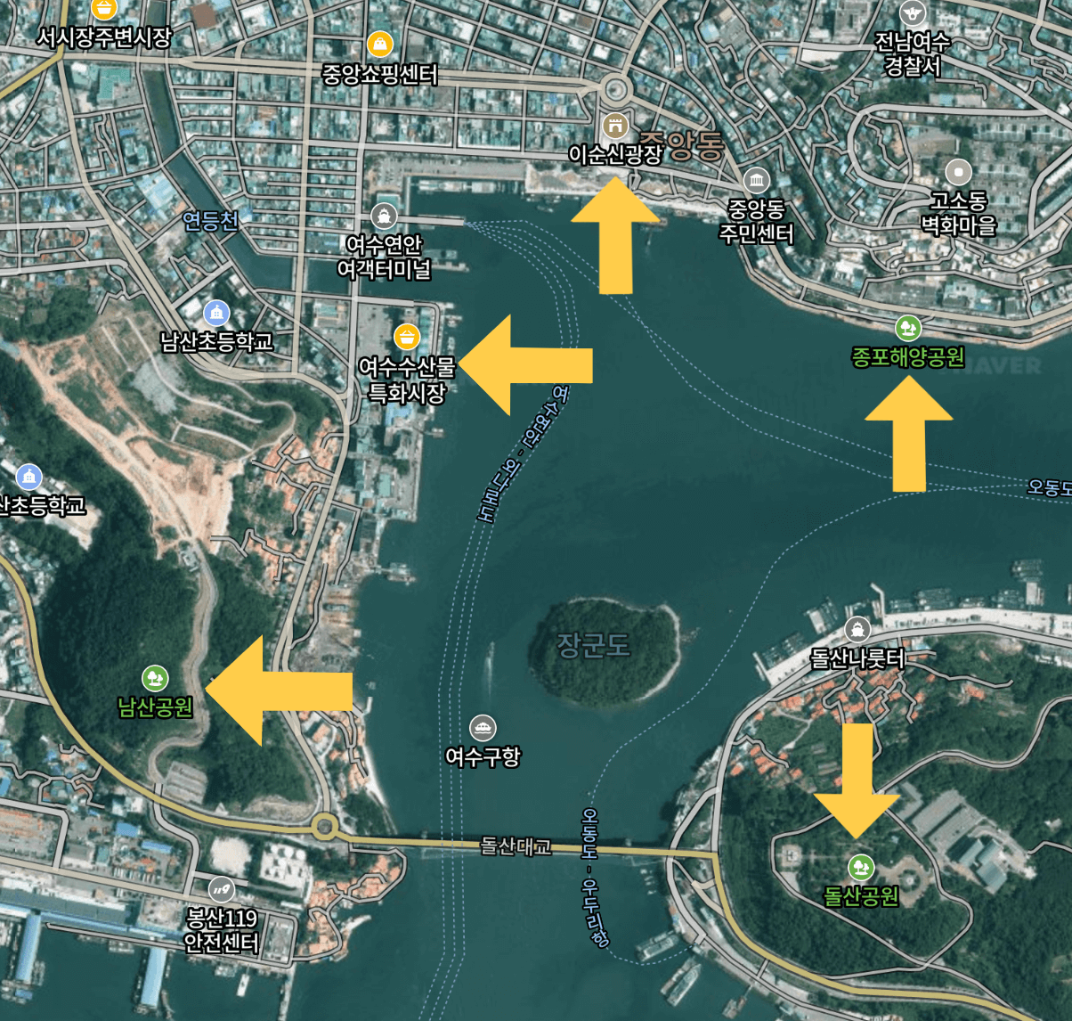 ▷ 개인적으론 남산 주변이나 여수 수산물 특화시장 주변을 추천합니다. 다른 곳보다 조금은 한산하기도 하고 시간이 된다면