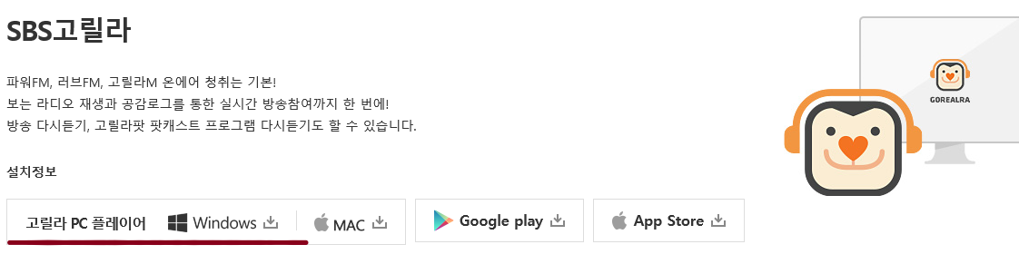 혹시 라디오를 들을 만한 플레이어가 없다면 고릴라 앱을 깔아 휴대폰이나 컴퓨터에서 들어보세요.