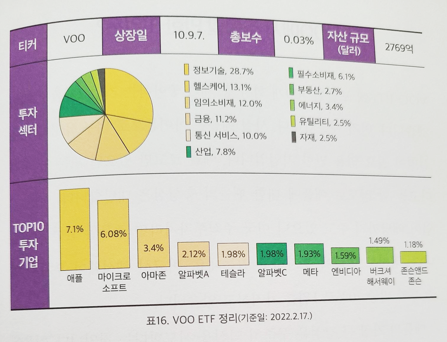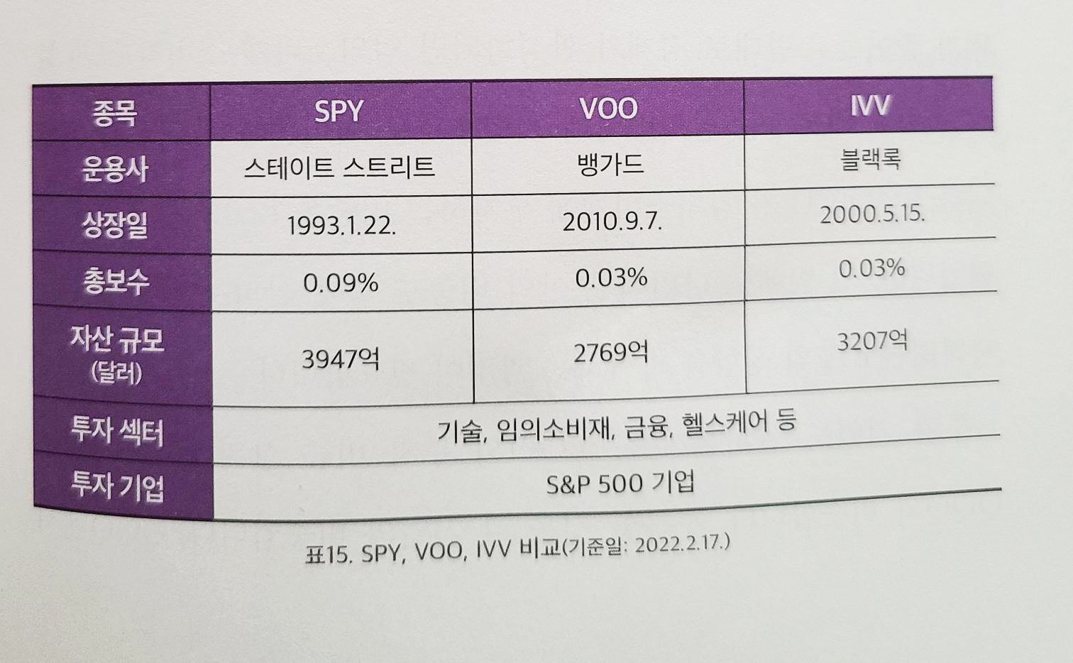 저자는 어차피 같은 지수를 추종하는 상품은 투자 섹터나 기업도 같고 자산 역시 2500억 달러 이상으로 모두 안정적인 만큼 상대적으로 총보수(수수료)가 낮은 VOO ETF를 추천하고 있어요.